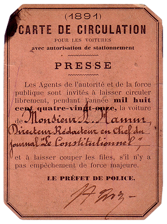 Contrairement à ce que l'on pourrait croire les marques concernant les véhicules ne datent pas d’hier. En témoigne cette carte de circulation - très utile, celle là - attribuée au rédacteur en chef du Constitutionnel à la fin du XIXe siècle, époque à laquelle, pourtant, la circulation et le stationnement devaient être moins compliqués que de nos jours.