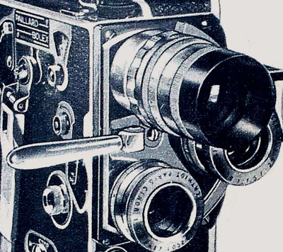 Sur cette ancienne gravure publicitaire de Paillard-Bollex se remarque le système antérieur : trois objectifs à focale fixe placés sur un socle rotatif qui permettait de passer rapidement de l'un à l'autre.
