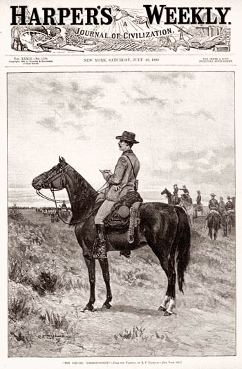 Les grands reporters avaient jadis tout intérêt à être des cavaliers émérites. De fait, le "Special correspondent" représenté par Harper's Weekly, bloc-notes en main et lasso au côté, suggère que les journalistes auraient facilement pu en remontrer à Indiana Jones.