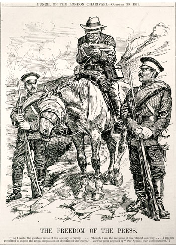 Malheureusement, la version publiée un quart de siècle plus tard par le magazine satirique Punch est un peu moins flatteuse avec son cavalier aux yeux et aux bras bandés : le contrôle croissant de l'information par les belligérants a laissé sa marque.