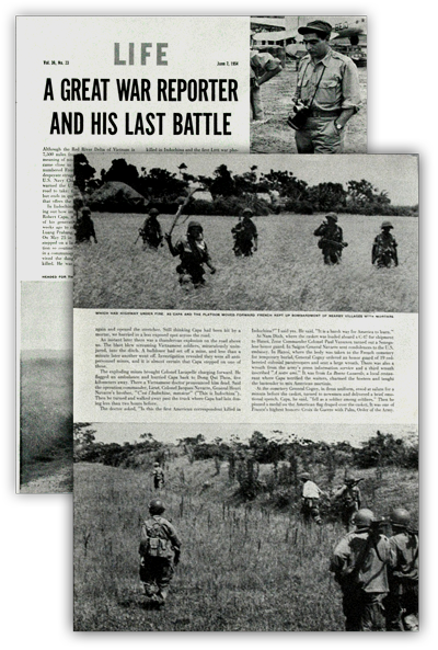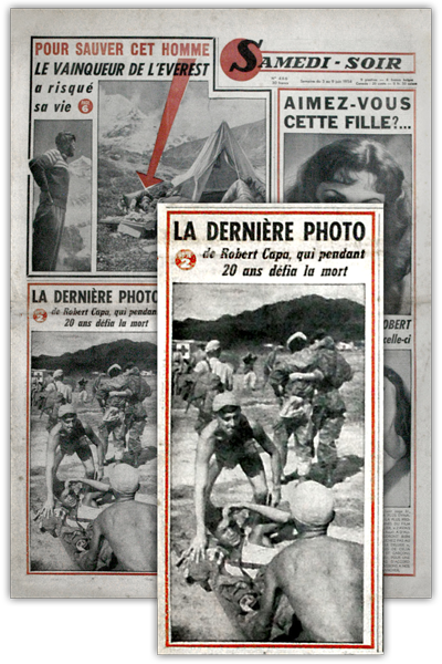 Se trouver au pire moment au pire endroit correspondait bien à son adage : « si tes photos ne sont pas assez bonnes, c'est que tu n'es pas assez près ». Mais c'est justement en s'éloignant un peu trop d'une patrouille française afin de mieux la cadrer qu'il trouvera la mort sur une mine en Indochine. Quant à sa « dernière photo », ce n'est pas celle reproduite par Samedi-Soir (à gauche) mais bien celle publiée par Life (en bas à droite) |