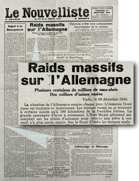 Leurs confrères français ont réussi la même manœuvre à Lyon avec une édition pirate du Nouvelliste, qu'ils ont substituée à l'originale dans les kiosques en prétendant, comble du toupet, agir sur ordre de la censure allemande. Le temps que celle-ci réalise ce qui se passait, 30 000 acheteurs éberlués sautaient d'un article sur les infamies de la milice ou de la Gestapo à un autre sur les déboires de la Wehrmacht. |