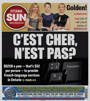 IdiomeQuand un tabloïd anglophone choisit de s'exprimer en français, c'est rarement pour dire quelque chose de gentil. Ainsi, le Sun de Londres a-t-il plusieurs fois exprimé dans cette langue le peu de bien qu'il pensait de la position française sur l'invasion de l'Irak. Pour sa part, son homonyme d'Ottawa a décidé de s'en prendre au coût élevé que représentent pour l'Ontario les services administratifs et l'éducation dispensés en français.Pourtant, son équipe aurait peut-être gagné à profiter de ces cours, si l'on en juge par la monstrueuse faute de syntaxe de son titre. Il ne s'est, du reste, pas donné beaucoup plus de mal pour son enquête, se contentant de reproduire le rapport d'un think-tank ultralibéral. |