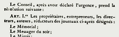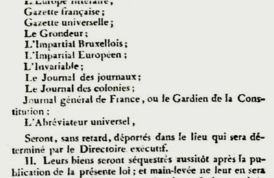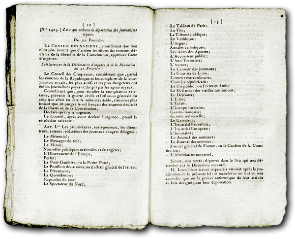 Aussitôt purgé par un vigoureux coup d'État, le Conseil des Cinq-cents édicte que « parmi les ennemis de la république (...) les plus actifs et les plus dangereux ont été les journalistes payés et dirigés par les agents royaux » et ordonne dans la foulée la déportation en Guyane des propriétaires, entrepreneurs, directeurs, auteurs et rédacteurs de plus de quarante journaux. |