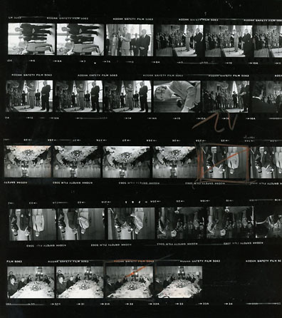 * Avant l'essor du numérique, les planches contact permettaient d'examiner la totalité d'une pellicule en plaçant celle-ci sur une feuille de papier photosensible que l'on exposait à la lumière avant de la développer comme une photo ordinaire. Un crayon gras était utilisé pour spécifier les vues à tirer, en indiquant éventuellement leur recadrage. |