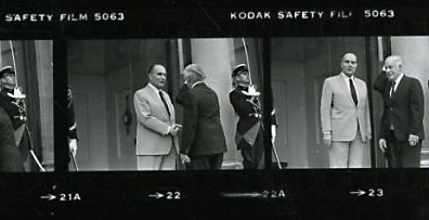Sur cette planche contact* figurent deux hommes politiques... mais combien de journalistes ? François Mitterrand pourrait passer pour tel : après avoir collaboré avant la guerre au quotidien L'Écho de Paris (droite nationaliste), il a animé vers la fin de celle-ci le journal L'Homme libre du mouvement des prisonniers et déportés (MNPGD), pour lequel il a notamment couvert comme journaliste le procès de Pétain (il signe ici l'éditorial sous le nom de guerre de François Morland). Mais ses fonctions éditoriales les plus inattendues sont celles qu'il a assumées quelque temps comme directeur du magazine Votre Beauté, emploi insolite offert à un Mitterrand désargenté par des amis bien placés. Pour autant, les rencontres du futur président français avec la presse, dictées par des considérations idéologiques ou financières, ne suggèrent aucune affinité particulière pour le journalisme, comme cela se confirmera par la suite.