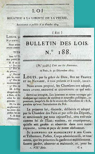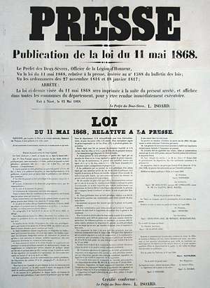 Liberté provisoire La liberté de la presse est un excellent révélateur du niveau de démocratie d'un pays. En France, les fluctuations incessantes de celle-ci au XIXème siècle traduiront fidèlement l'accouchement cahotique de la république. La règle du jeu changeait si souvent (14 fois en 50 ans) qu'il était bien utile qu'elle fût affichée. 1818 : Libéralisation. L'autorisation préalable à la publication est remplacée par une simple déclaration (et un cautionnement). 1820 : Lois répressives. 1821 : Répression accrue. Création du délit de «mauvais esprit». 1828 : Libéralisation. Abolition du délit de mauvais esprit et de l'autorisation préalable. 1830 : Le rétablissement de la censure par Charles X déclenche une insurrection - les « trois glorieuses » - qui conduira à l'abdication du roi. 1830 : Abolition de la censure. Baisse du cautionnement. 1835 : Rétablissement de la censure et augmentation du cautionnement. («Lois scélérates»). 1848 (févr.): Libéralisation. 1848 (août) : Répression. Nouveaux délits et cautionnement. 1848 (nov.) : Libéralisation. La constitution consacre la liberté de la presse et l'abrogation de la censure. 1849 : Répression. Retour aux lois de 1835. 1851 : Suspension de la liberté de la presse. 1852 : Autorisation préalable et cautionnement. 1868 : Libéralisation. Une nuée de journaux s'engouffrent dans la brèche ouverte. En 1881, enfin, la liberté de la presse s'appuiera sur une législation stable. Il faudra pour cela supprimer près de 300 articles de loi votés au cours du XIXème siècle.
