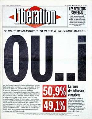 Concision L'art du titre est un exercice particulièrement délicat. Trouver comment condenser en quelques mots un événement souvent complexe peut, à défaut d'une inspiration subite, impliquer des séances de réflexion tendues, surtout quand les rotatives attendent. Libération a poussé cet art très loin, battant parfois au passage des records de brièveté comme le « DUR » qui saluait un plan d'austérité gouvernemental, ou ce « OUI » incertain pour le référendum de Maastricht. Le titre de deux lettres, voire d'une, reste à imprimer. En revanche, peu de journaux oseraient aujourd'hui le « roman» de 23 mots (et quatre propositions) tranquillement commis par les titreurs de Combat .