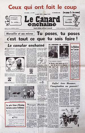 Dans des périodes plus calmes, la vigilance des pouvoirs peut emprunter des chemins moins directs mais non moins redoutables, comme, en 1973, la mise en place de micros clandestins pour identifier les informateurs du Canard Enchaîné. Qu'elles soient illégales ou, au contraire, judiciaires, les manuvres destinées à dévoiler les sources de la presse représentent en réalité pour la liberté de l'information un danger au moins aussi grand que la suppression pure et simple de quelques passages. |