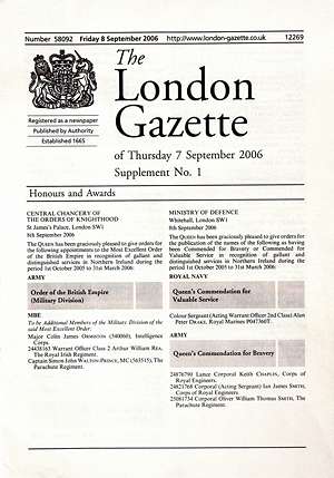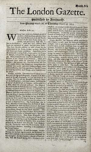 | Vétérans Près de 350 ans séparent ces deux éditions de la London Gazette, dont le premier numéro est paru du temps de Charles II. Aujourd'hui consacré aux annonces légales, il est l'un des plus anciens journaux à avoir été publié sans interruption et sous le même nom. Même la typographie de son titre n'a pas changé en trois siècles. |