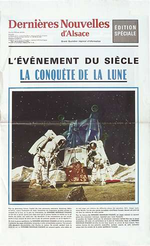 22-07-1969 L'alunissage d'Apollo 11 représentait aussi un problème journalistique. Retransmis en direct à la télévision, il obligeait les journaux à se situer en aval de l'événement immédiat, comme ici France Soir qui s'intéresse au retour des astronautes. Mais la presse a aussi pu montrer sa différence en amont de l'événement comme le Figaro, ainsi que dans une couverture beaucoup plus complète de celui-ci, à l'instar des Dernières nouvelles d'Alsace.