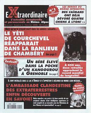 Bidonnages L'un est un titre national, l'autre un régional. Distribués en kiosques, ils avaient tous les dehors de véritables journaux. Il ne manquait, en fait, qu'un ingrédient : la vérité. Vaguement inspirées de l'américain Weekly World News (spécialiste des extraterrestres violeurs et autres chiens parlants) ces deux approches caricaturales de l'information, dont il est difficile de pleurer l'échec commercial, apportent la démonstration par l'absurde que ce n'est pas le papier ou l'encre qui fait un journal mais bien le rapport au réel et la façon dont on le traite. A une époque où les contenus plus ou moins incertains fleurissent sur Internet, cette valeur fondamentale de la « vraie » information mériterait peut-être d'être mieux mise en avant à condition d'être toujours affermie dans les pratiques professionnelles. Car la vérité, comme la justice ou l'égalité, fait partie de ces absolus dont on peut se rapprocher sans cesse mais jamais atteindre. |