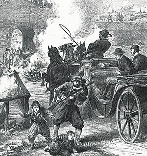 Les envoyés du Times et du London Illustrated News réchappent de justesse à l'attaque de Rustchuck. (London Illustrated News, 28.07.1877) |
